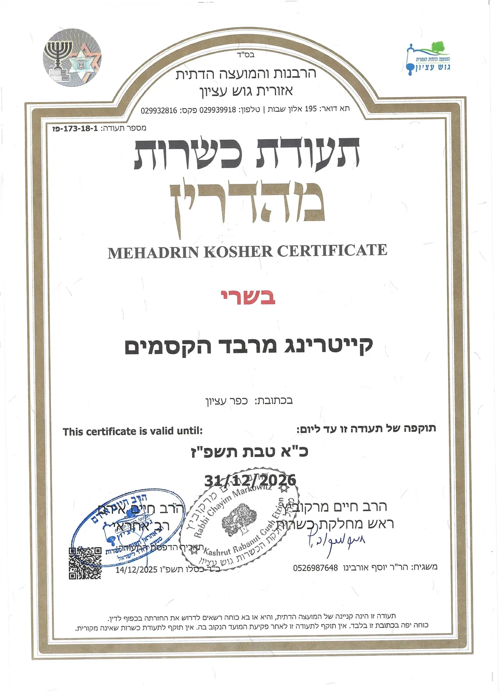 קייטרינג "מרבד הקסמים" כשר בהשגחת רבנות גוש עציון למהדרין בפיקוח הרב חיים מרקוביץ